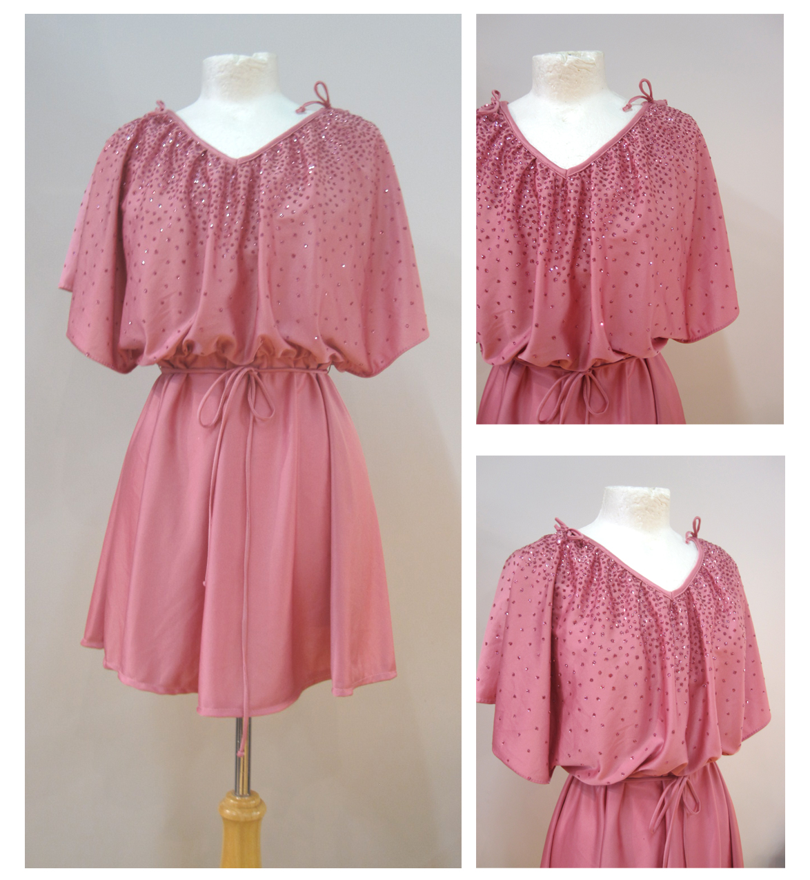 dusty rose v-neck dress, dark pink sparkles, bowtie detail on the shoulders and a tie waist.